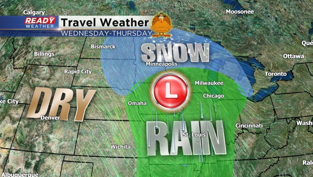 Your turkey might not be dry, but the weather conditions will be on Thursday for Thanksgiving. However, Wednesday is a different story. Look for pesky rain showers to continue throughout the day and into the night. Low pressure will slide just to the south of us. We could even see a few wet snow flakes in the beginning of the event early Wednesday morning.
