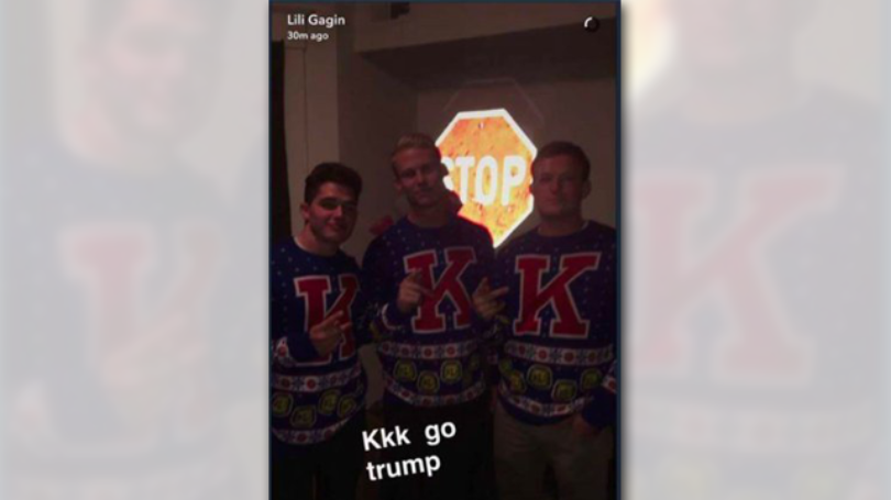 (CBSNews) LAWRENCE, Kan. -- A University of Kansas cheerleader and three members of the school’s spirit squad are suspended from cheering after a photo linking the Ku Klux Klan with President-elect Donald Trump was posted on the cheerleader’s Snapchat account.
