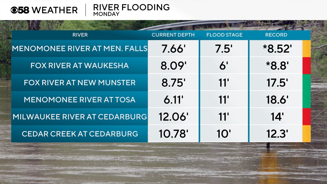 While that additional rain likely didn't make any flooding conditions worse, it definitely didn't make them better and likely prolonged the high water and flooding that was already in progress from basements and yards to parks and water over roadways. Two area rivers at currently at moderate flood stage: Fox River at Waukesha and Milwaukee River at Cedarburg. Many other rivers are at minor flood stage or just below flood stage. The only river currently rising Wednesday morning is the Fox River at New Munster. Flood stage there is expected to be reached over the next few days with flooding lingering into the weekend.