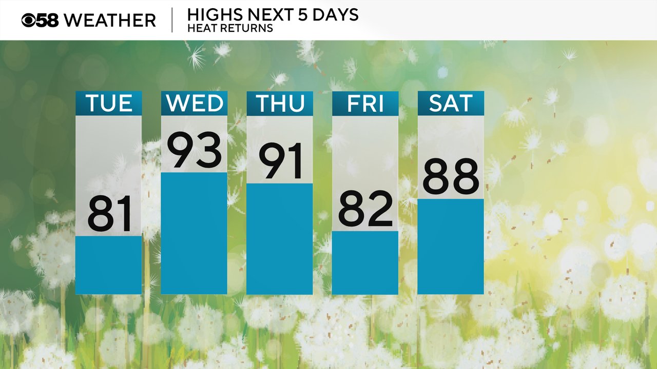 Temperatures and humidity levels will start to increase Tuesday with highs around 80 and dew points reaching the middle 60s making it pretty muggy. More heat is on the way Wednesday and Thursday with highs reaching the low 90s. It doesn't look as hot as it once did but still plenty warm around 90 at least. Friday might touch a cool back to average but then the warmth kicks right back in for the weekend and beyond with highs in the upper 80s to around 90.