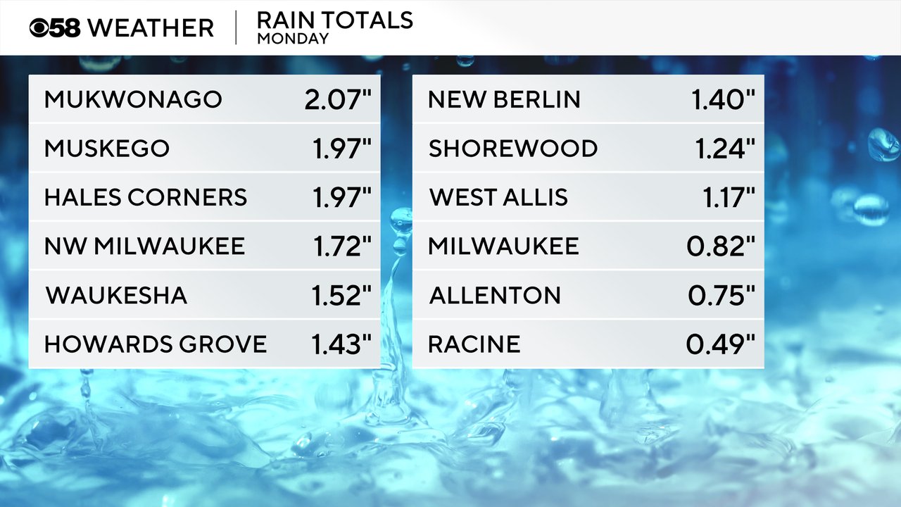 We had quite the light show Monday evening as a cluster of storms rolled through southeast Wisconsin. Some of the storms were strong to seven severe. We also had a few storms in the later afternoon hours and even some storms and downpours in the late morning and early afternoon. All of that rain added up with parts of southeast Wisconsin getting around 2" of rain.