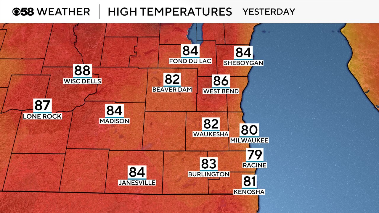 Over last weekend we finally saw average and even above average high temperatures return to southeast Wisconsin and we have stayed above average since then with highs in the mid to upper 70s and finally now an 80 degree day. The high in Milwaukee reached 80 degrees exactly on Wednesday for our first day in the 80s this month. We were still warmer inland in the low to middle 80s since we had a lake breeze kick in during the afternoon hours.