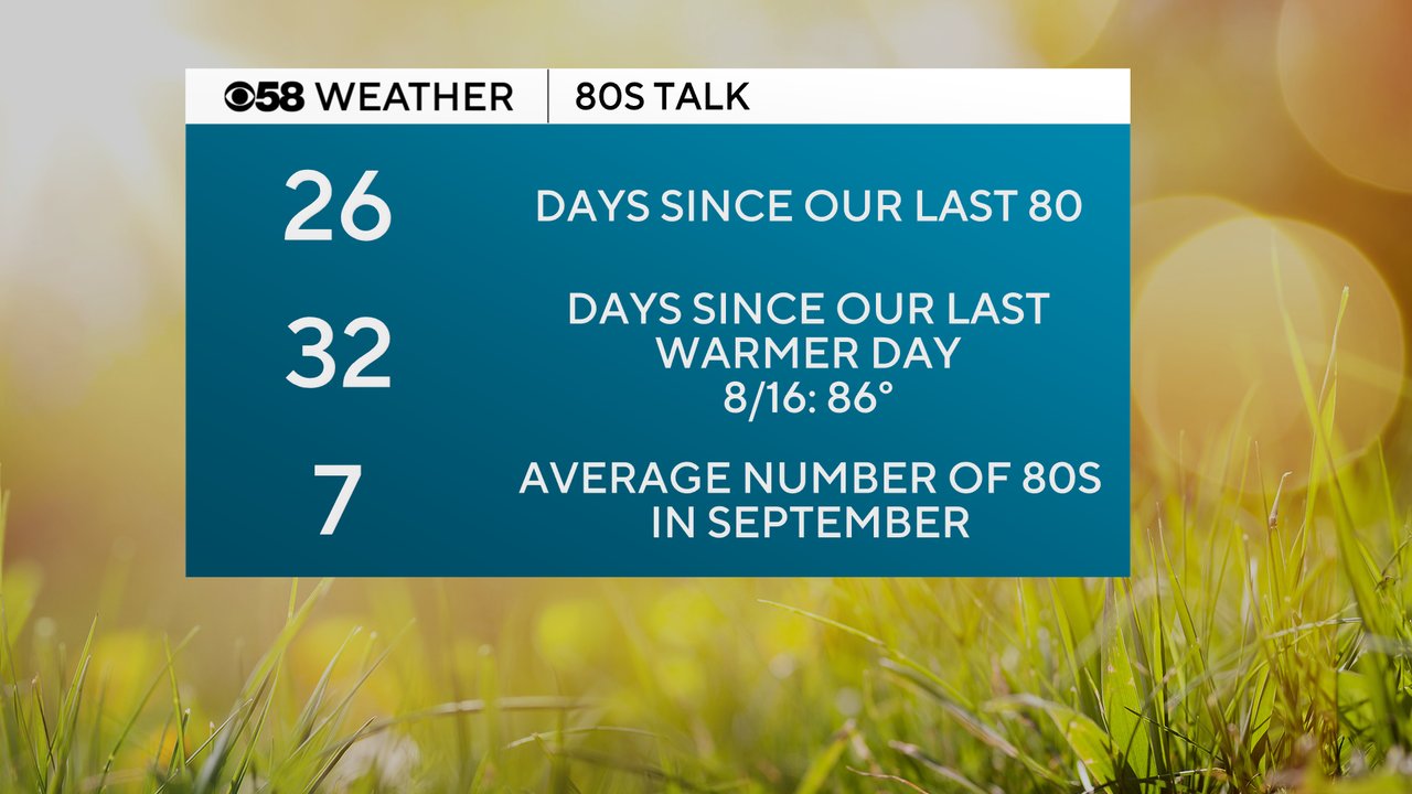 That 80 was the first one in a September month that usually sees seven days in the 80s during the month. So we are really lacking on warmth for the month. It was our first 80 degree day since August 22nd, 26 days ago.