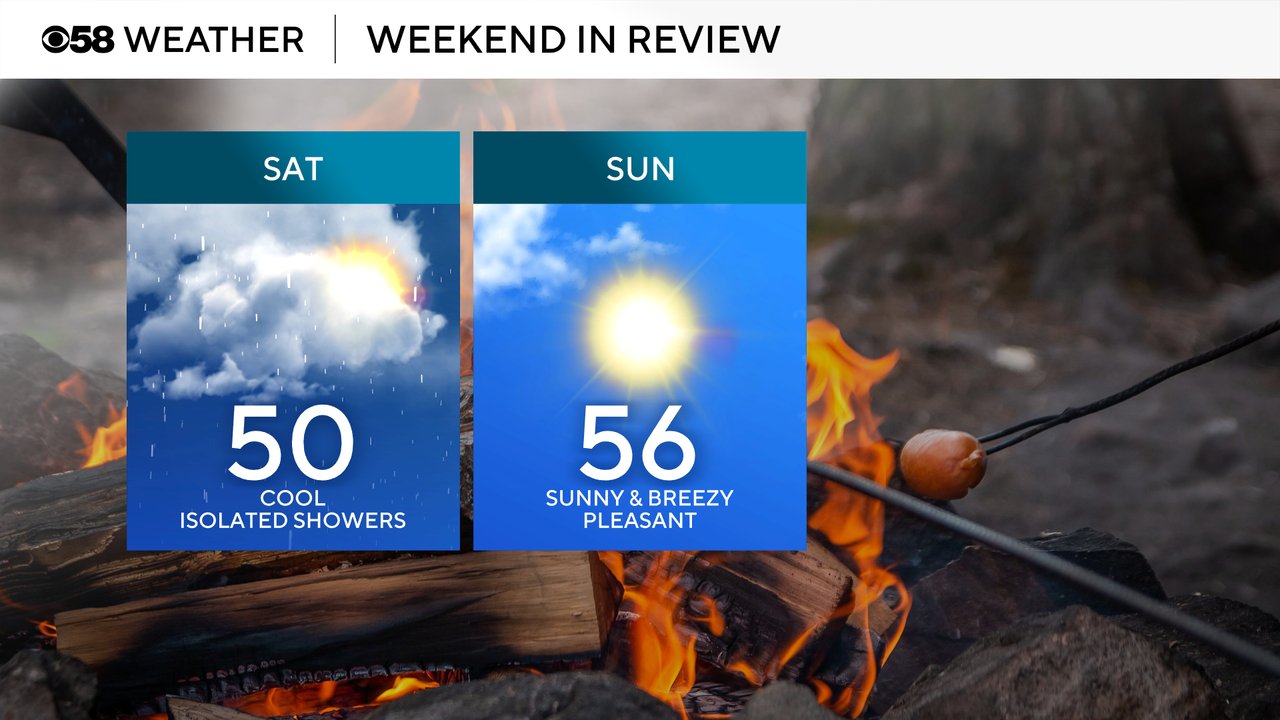 After the chilly start to Saturday we saw highs stay cool only warming to 50 degrees with some decent clouds and a few isolated showers and downpours rolling through. Sunday was a warmer day with highs in the mid 50s under a sunny and breezy sky.