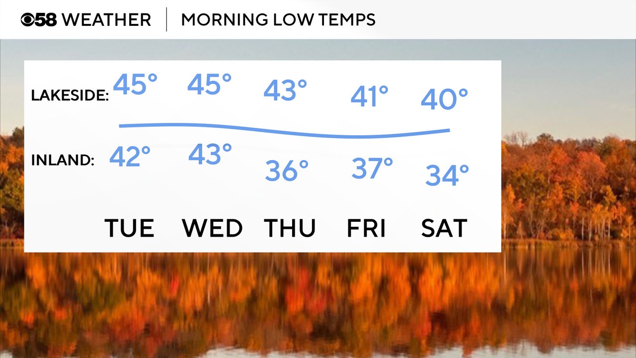 A lake breeze kept temps lakeside mild Monday morning in the upper 40s but inland areas weren't as lucky with a frost and freeze in some areas in the 30s. We mostly stay away from frost/freeze concerns Tuesday and Wednesday morning waking up in the 40s but Thursday and Friday mornings could see a patchy frost inland and Saturday could see a widespread frost inland and even a patchy freeze.
