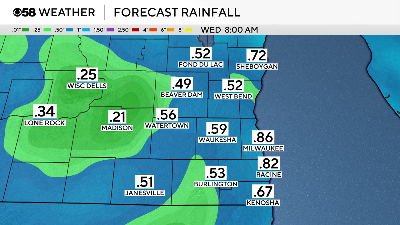 With scattered storms possible both Monday and Tuesday, parts of southeast Wisconsin could see 0.25-0.75" of rainfall over the next 48 hours.