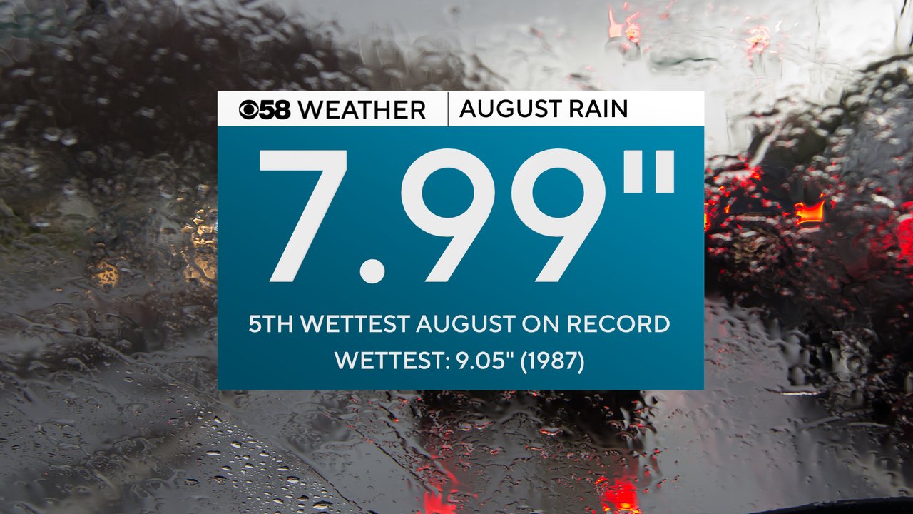 The first week of August was all dry but then the flood gates literally opened with historic rainfall on Saturday and more rain Sunday and again on Tuesday. Once you add up rainfall over those three days Milwaukee is sitting at an official total of 7.99" of rain. That is enough to be the fifth wettest August on record. The current wettest August on record was in 1978 when we had just over 9" of rain.