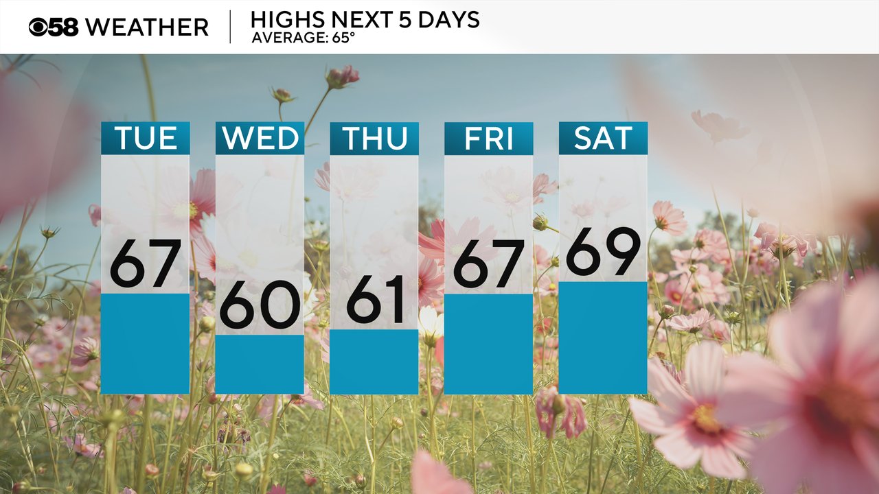 Highs over the next five days will stay cool. We see highs Tuesday afternoon in the mid to upper 60s which is technically still above average for this time of year. Wednesday and Thursday will be the coolest days of the week with highs around 60 then we warm into the upper 60s to around 70 for the weekend.
