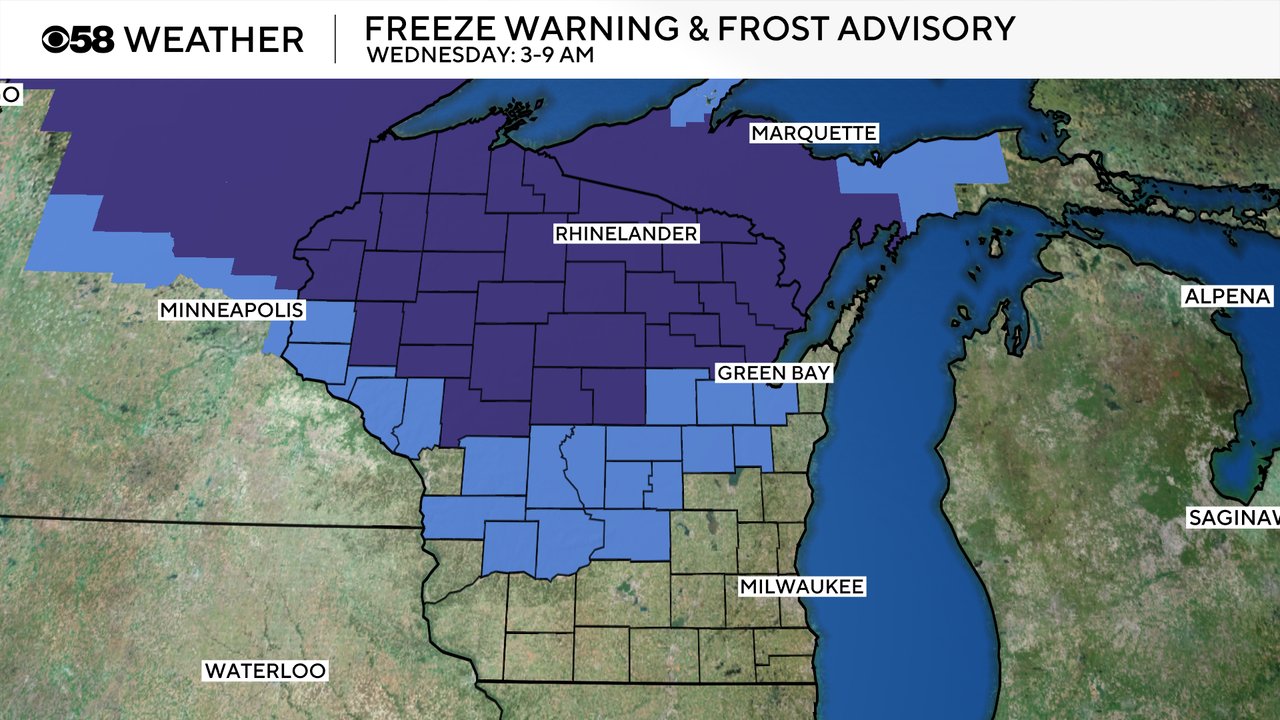 No cold weather headlines have been issued for us in southeast Wisconsin but northern Wisconsin is under a freeze warning and central Wisconsin is under a frost advisory for Wednesday morning from 3-9 AM.