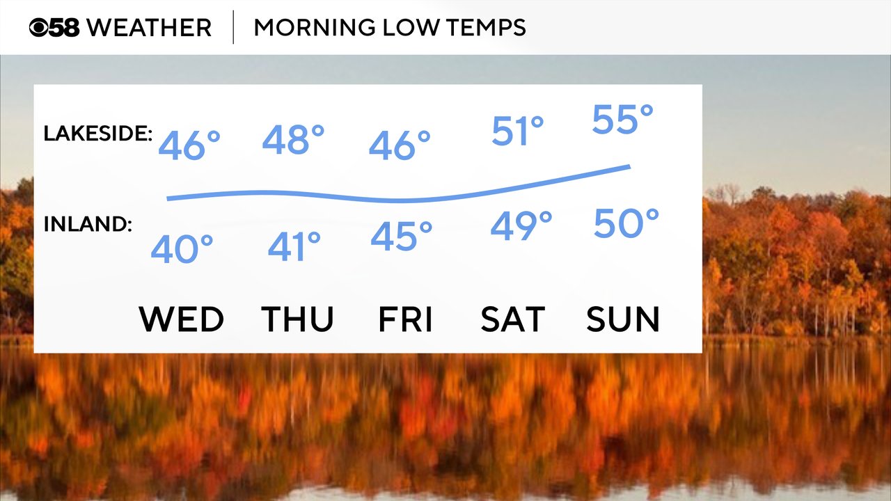 Low temps will drop into the 40s over the next few mornings for the coolest temps since the beginning of September. Some inland locations may hover right around 40 with some isolated upper 30s possible. By the weekend the overnight temperatures warm just a bit.