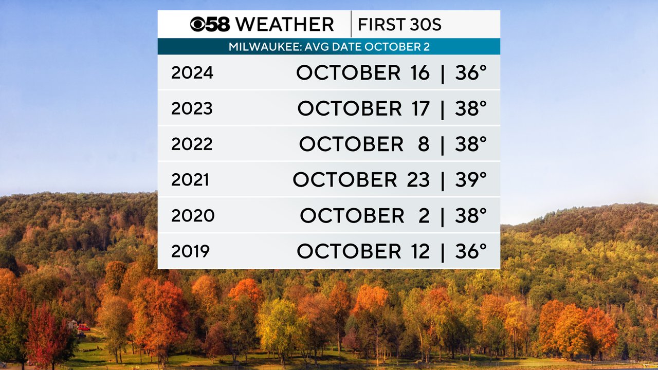 Milwaukee stayed above the freezing mark but still dealt with a widespread frost and lows in the mid 30s. It wasn't just the first frost of the season in Milwaukee but also the first time they lows dropped into the 30s at all. That came well later than the average of October 2nd and is the latest first morning in the 30s since 2017.