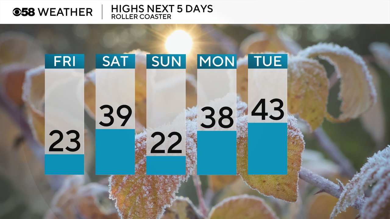 The roller coaster with the temps is now here with wind chills staying well below-zero Friday morning then warming to the low 20s for highs Friday afternoon. Saturday will see more warmth with highs in the upper 30s then Sunday cools right back down again. Monday looks to be another above average day with highs in the upper 30s and then the warmth stays with 40s on the way for the days leading up to Christmas and Christmas Day itself could hit 50!