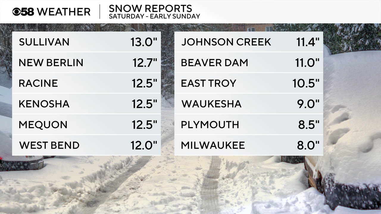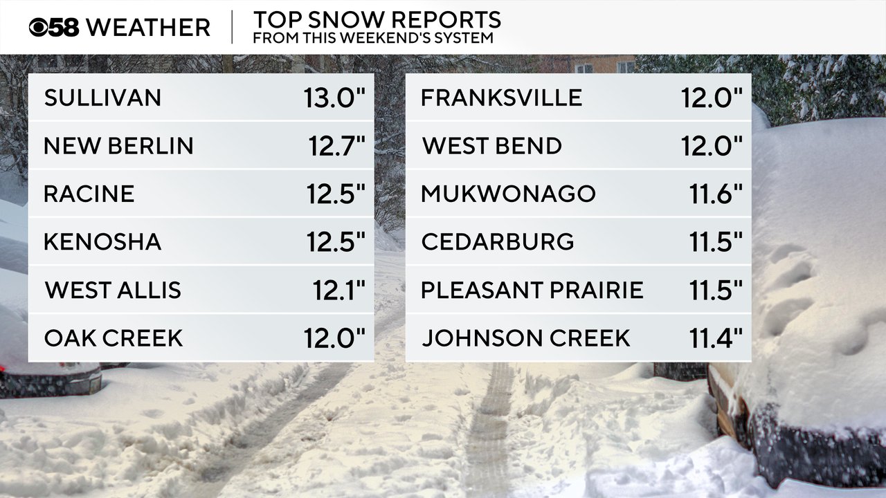 The wildcard going into the storm system was going to be in the influence of Lake Michigan. Areas right near the Lake had a very wet, heavy snow that even mixed with rain at times. But just a few miles inland all of that Lake moisture meant much higher snow totals as the snow became drier. Our highest totals weren't confined to one area with spots like Sullivan out west getting close to the same as western parts of Racine and Kenosha. The highest totals were from 11-13".