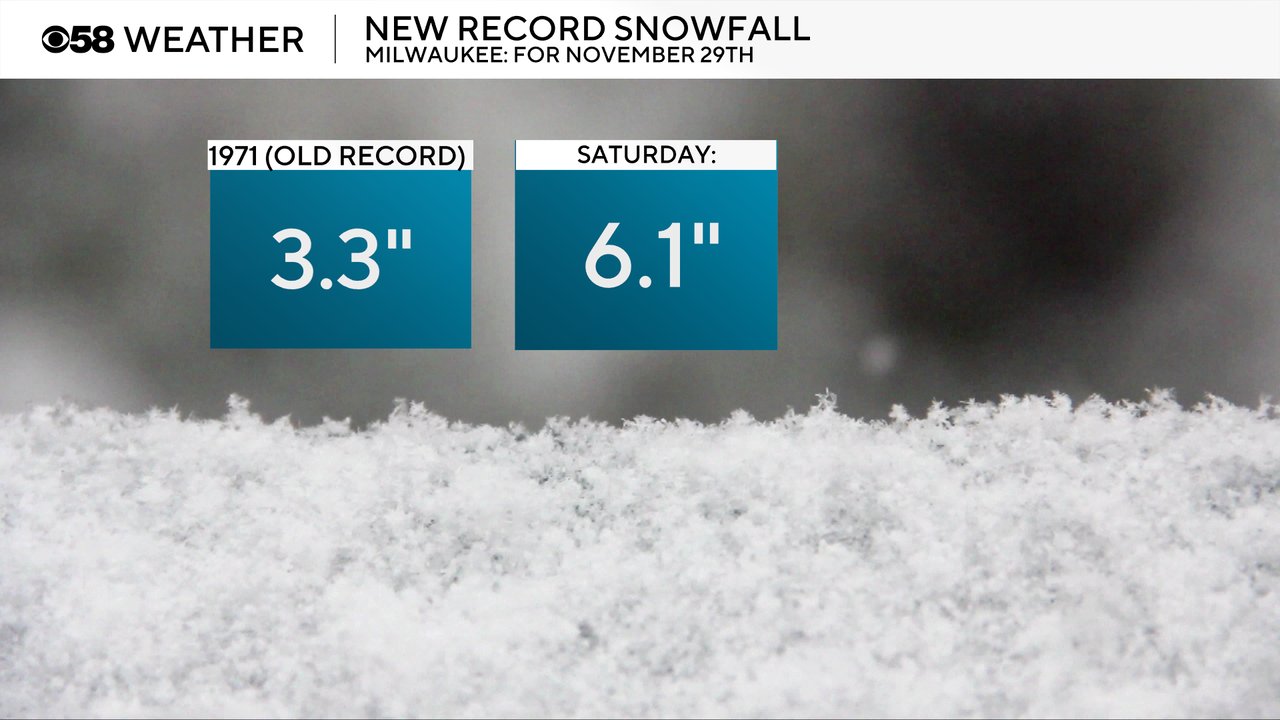 Milwaukee saw record snowfall for the date on Saturday, November 29th. The old record for daily snowfall was 3.3" set back in 1971. But on Saturday alone Milwaukee picked up 6.1" shattering that old record.