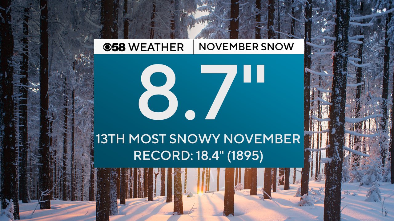 That also pushed our November snowfall to 8.7" for the month which goes down as the 13th most snowy November on record. The record snowiest November was about 10" more back in 1895.