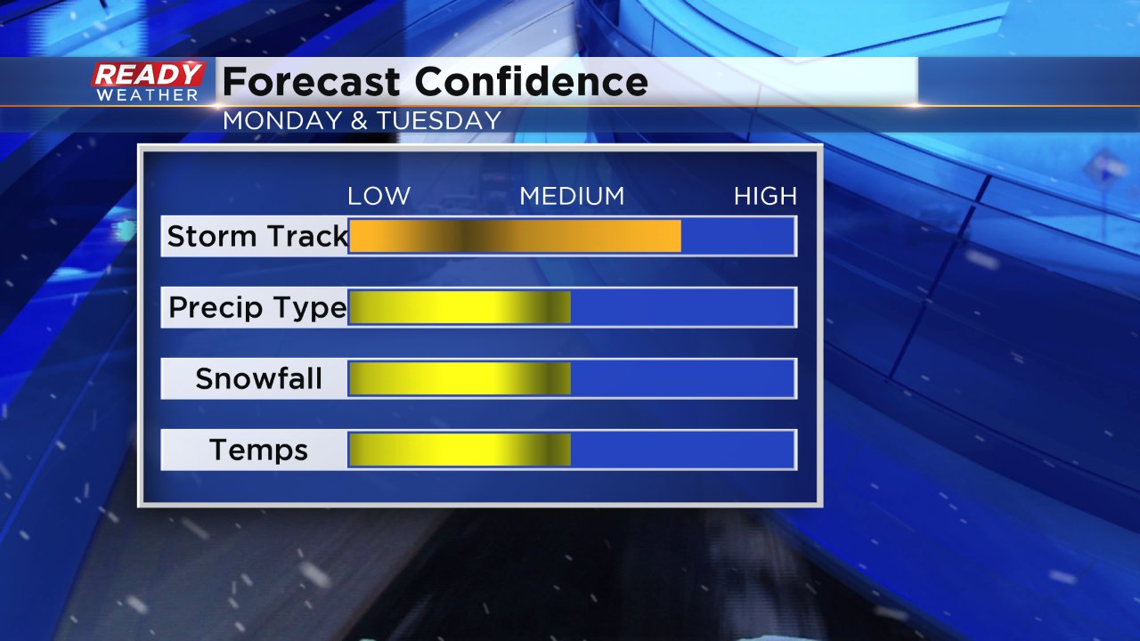 We may see a brief period of rain and snow on Monday during the late morning before switching to all snow in the afternoon. Weather models are starting to come into more of a consensus on the track of the storm, but there are still some questions regarding exact snowfall totals and temperatures.
