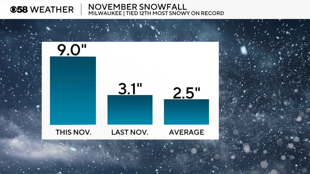 Welcome to December! November is in the record books! The month, obviously, ended up snowy with the first widespread snowstorm of the season on the last two days of the month. That snow pushed Milwaukee's monthly snow total for November to 9" which is well above average and enough to go down tied for the 12th snowiest December on record.