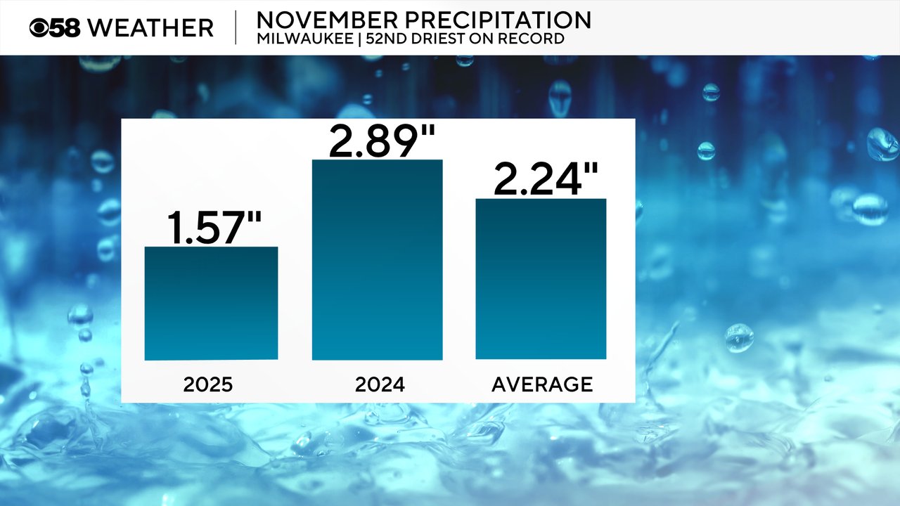 While November was snowy, it was actually relatively dry. The month saw 1.57" of total precipitation which combines any rain with the liquid equivalent of any snow. That is about 0.75" behind average and goes down as the 52nd driest November on record.