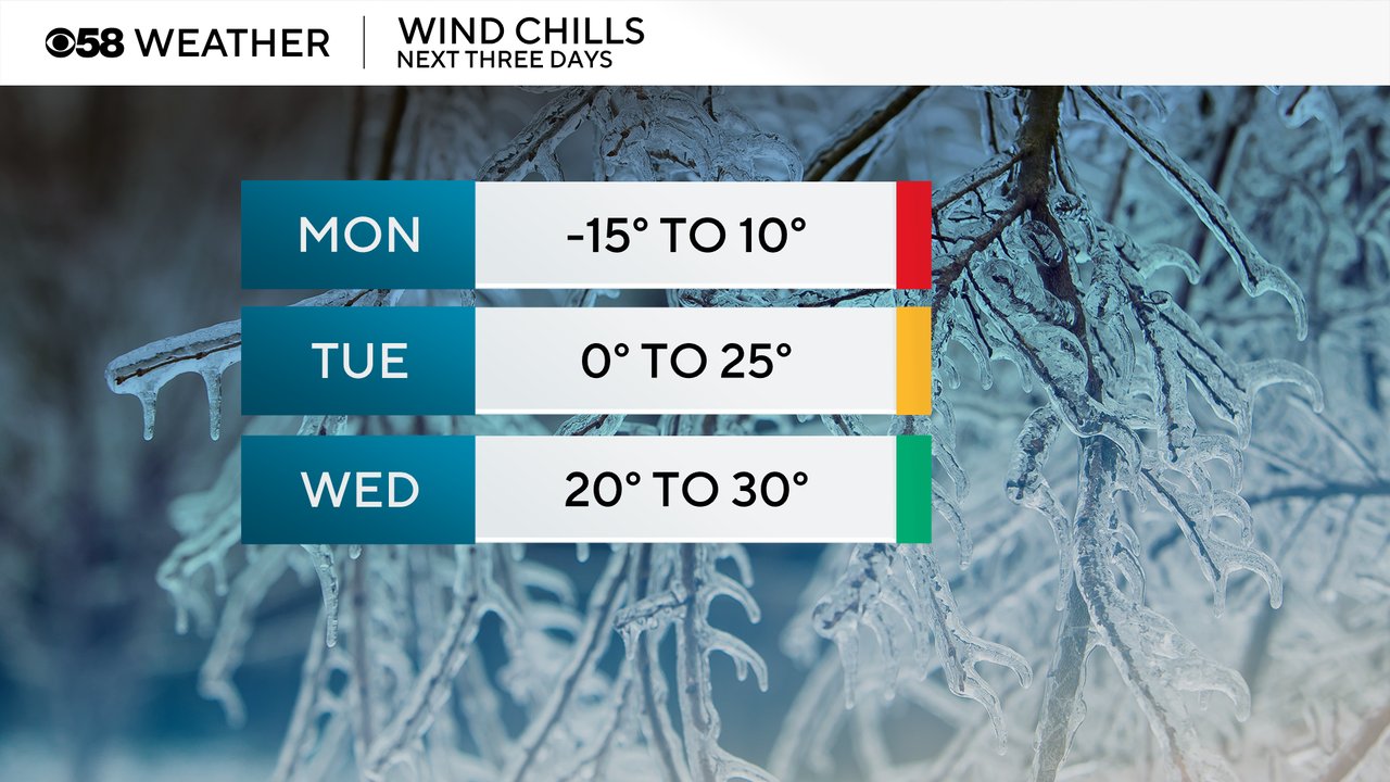 Temperatures will stay chilly on Monday waking up to wind chills below-zero. By the late morning or midday hours we will finally see those wind chills get above-zero with afternoon wind chills around 10 above. Tuesday morning could still be cold with lows in the teens and wind chills as cold as 0 but gets much better in the afternoon with wind chills in the 20s. Wednesday is just fine with wind chills in the 20s most of the day.